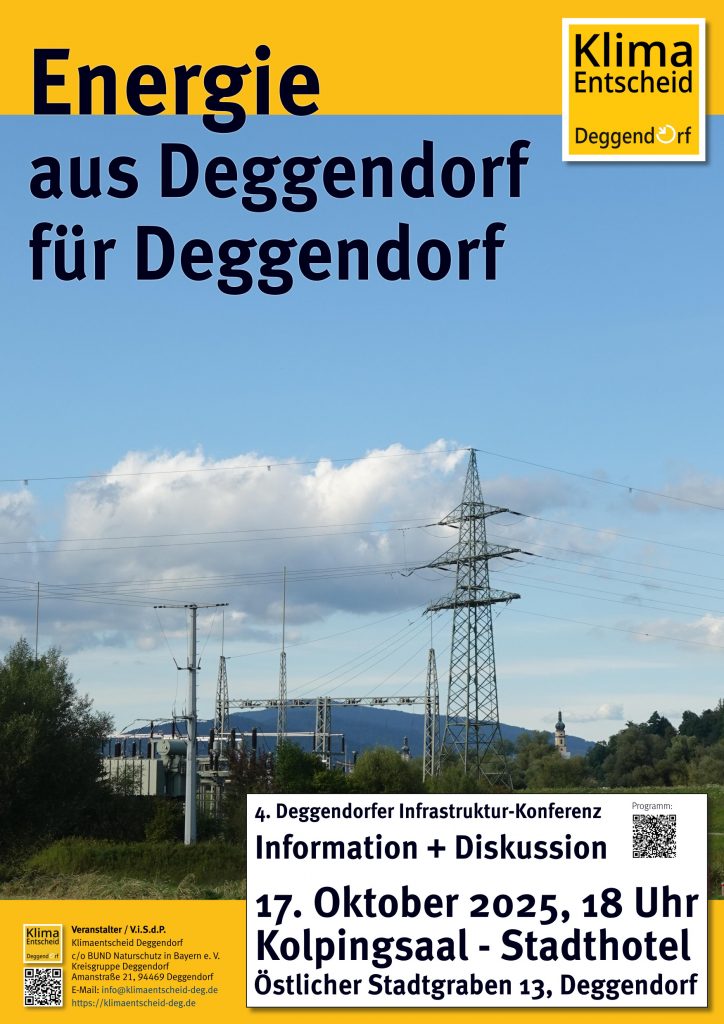 Am Freitag, den 17.10 ab 18 Uhr richtet die Aktionsgruppe Klimaentscheid Deggendorf im Kolpingsaal im Stadthotel die vierte Deggendorfer Infrastrukturkonferenz aus, die diesmal die zukünftige Entwicklung der Energieversorgung in den Fokus nimmt.